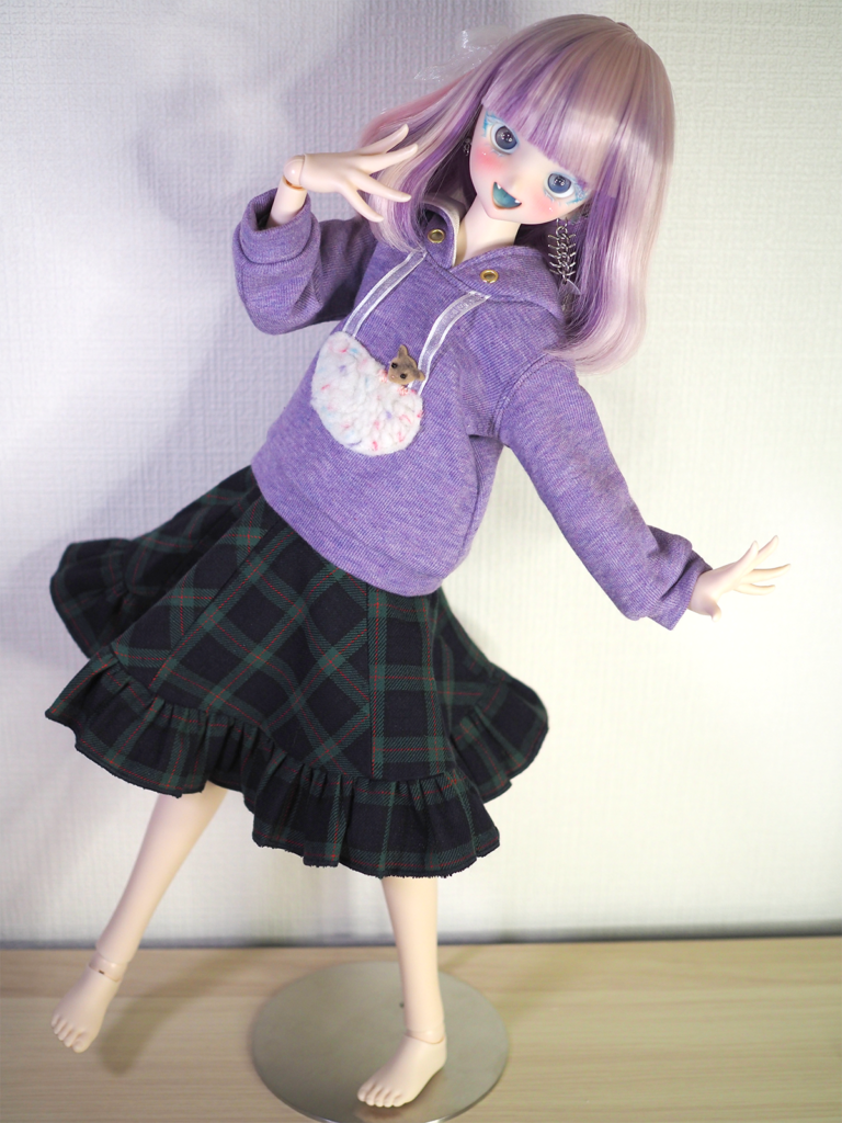 紫色のフクロモモンガパーカーと、チェックのスカート!
